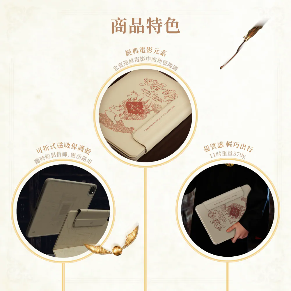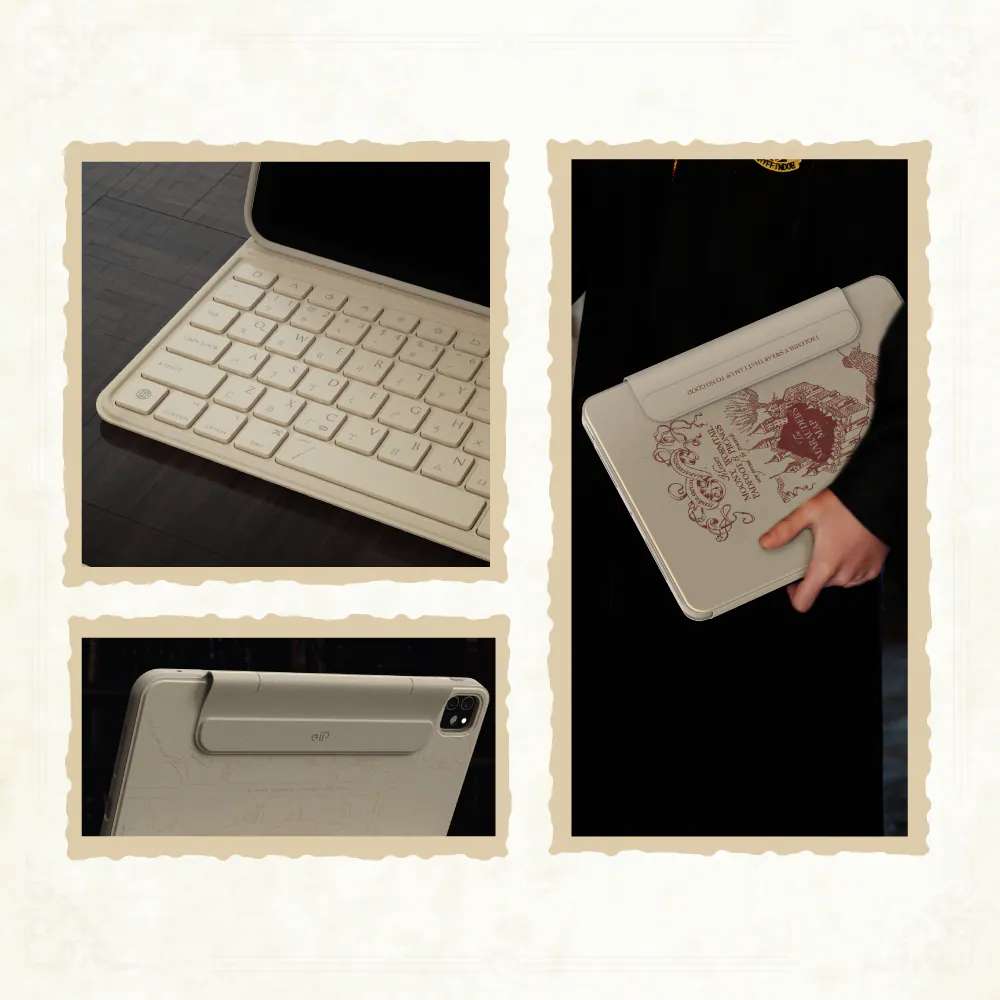 eiP 哈利波特 iPad鍵盤保護殼 劫盜地圖 (iPad Air7 11″ M3 2025款) 華納兄弟探索全球消費品部首次授權臺灣數位產品設計公司「eiP」推出哈利波特主題iPad 週邊。 採用哈利波特的經典劫盜地圖圖案設計,讓iPad的工作學習效率最大化。它不僅能保護iPad,看著地圖上紋路設計為使用者帶來冒險般的感受。這款鍵盤保護殼可以與iPad完美搭配,是哈利波特迷的必備收藏品。 專為 iPad 和 Apple Pencil 設計的劫盜藍牙鍵盤,集創新設計與魔法元素於一身,滿足高效創作需求。 【注意事項】 在充電時或啟用背光模式時,電量顯示可能會出現誤差皆屬正常現象