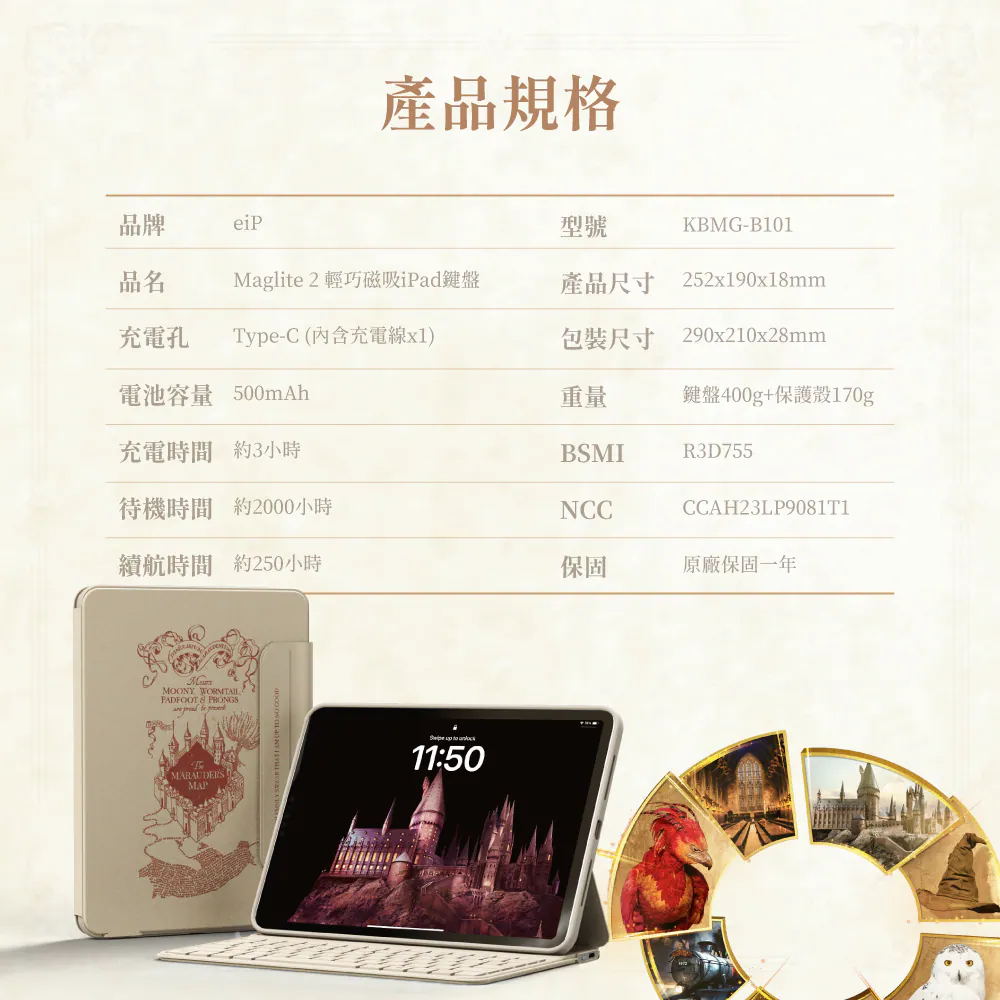 eiP 哈利波特 iPad鍵盤保護殼 劫盜地圖 (iPad Pro 11" M4/M5) 華納兄弟探索全球消費品部首次授權臺灣數位產品設計公司「eiP」推出哈利波特主題iPad 週邊。 採用哈利波特的經典劫盜地圖圖案設計,讓iPad的工作學習效率最大化。它不僅能保護iPad,看著地圖上紋路設計為使用者帶來冒險般的感受。這款鍵盤保護殼可以與iPad完美搭配,是哈利波特迷的必備收藏品。 【注意事項】 在充電時或啟用背光模式時,電量顯示可能會出現誤差皆屬正常現象