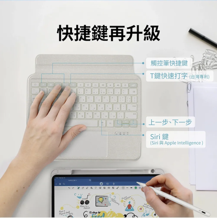 eiP Magnetix 2 可拆式鍵盤 (iPad 11 (A16)) 超輕!鍵盤+保護殼不到600g,支援觸控板、快捷鍵與筆寫模式,功能不打折,價格只要原廠三分之一,CP值爆表! - 智能快捷鍵再進化 T鍵速打模式|台灣專利,輸入更直覺 Siri專屬鍵|快速呼叫Siri或Apple Intelligence 觸控筆快捷|一鍵切換原子筆、螢光筆、橡皮擦 - 觸控式軌跡板,全方位操控 輕點、滑動、兩指捏合、三指滑動…操作就像MacBook般自然順手,支援多種手勢 - 磁吸可拆式設計 瞬間拆開,輕鬆追劇繪圖,合上即刻化身小筆電 - 無段式支架 180°自由調整,橫直皆穩固,自由調角無極限 - 直橫兩用 角度更舒適 貼心小折角設計,直立也穩當