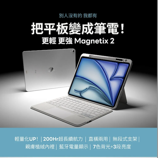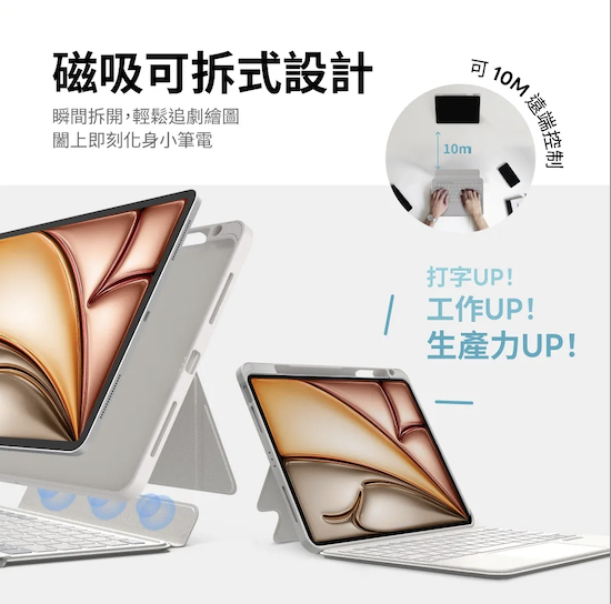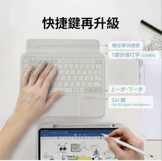 eiP Magnetix 2 可拆式鍵盤 (iPad Pro 11″(M5)) 超輕!鍵盤+保護殼不到600g,支援觸控板、快捷鍵與筆寫模式,功能不打折,價格只要原廠三分之一,CP值爆表! - 智能快捷鍵再進化 T鍵速打模式|台灣專利,輸入更直覺 Siri專屬鍵|快速呼叫Siri或Apple Intelligence 觸控筆快捷|一鍵切換原子筆、螢光筆、橡皮擦 - 觸控式軌跡板,全方位操控 輕點、滑動、兩指捏合、三指滑動…操作就像MacBook般自然順手,支援多種手勢 - 磁吸可拆式設計 瞬間拆開,輕鬆追劇繪圖,合上即刻化身小筆電 - 無段式支架 180°自由調整,橫直皆穩固,自由調角無極限 - 直橫兩用 角度更舒適 貼心小折角設計,直立也穩當