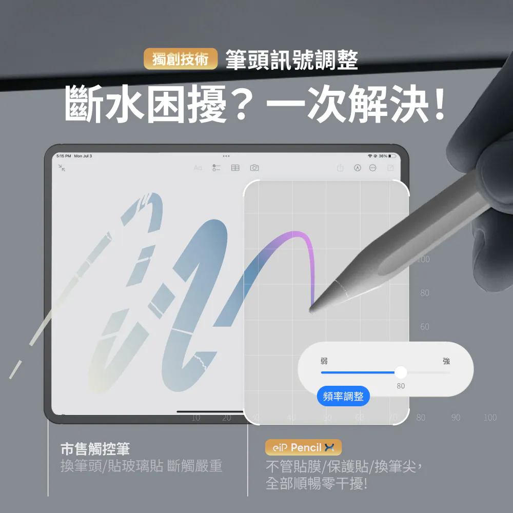 eiP Pencil X 觸控筆 (性能解放,全面主宰) 寫感巔峰,全面突破! 重新定義您的專屬觸控筆 支援 iPad 10/11 系列、iPad Air (M2 / M3)、iPad Pro (M4 / M5) 適用於 2018 年後推出的所有 iPad 機型 【獨創!筆頭訊號調整技術】 不管是貼膜or換筆尖,筆筆流暢零干擾 3種筆尖獨立儲存,切換筆尖時可快速匹配最佳書寫模式 【快捷功能由你決定】 透過專屬 APP 自訂筆尾快捷鍵,自由設定多個 App 的專屬功能,一鍵呼叫創作靈感 【產品特色】 - 精準書寫,流暢穩定不卡頓 - 附 金屬筆尖,筆觸更細膩自然 - 10 小時超長續航力 - 可自定義電量顯示燈