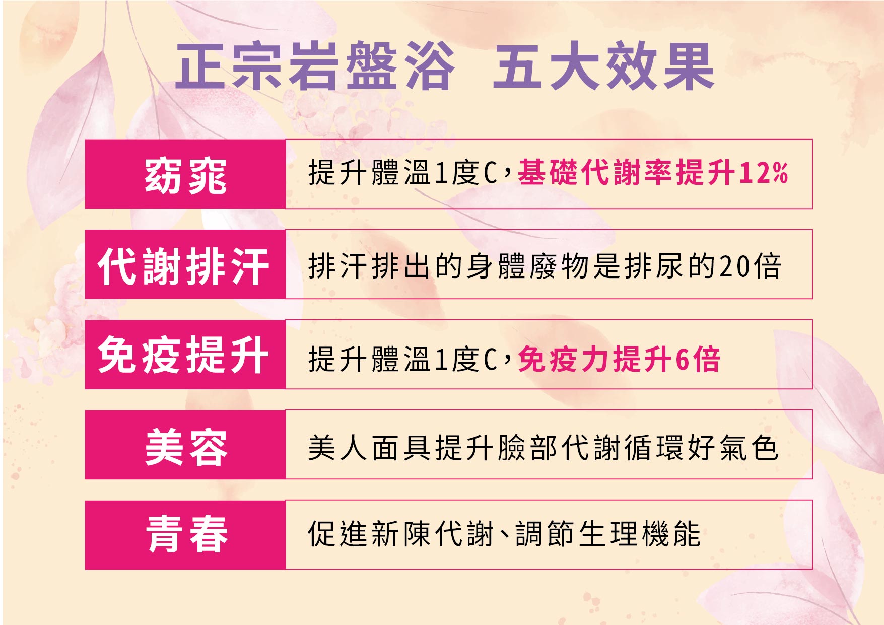 岩盤浴-俗稱乾式浴場或乾式溫泉,是不用水的泡湯方式,也可稱為城市溫泉,在日本是非常流行的健康養生之道,躺在溫熱天然能量礦石上,透過低溫排汗,由內而外促進新陳代謝,進而調節生理機能與調整體質,達到健康維持,是忙碌與少運動現代人最適合的保養方式。