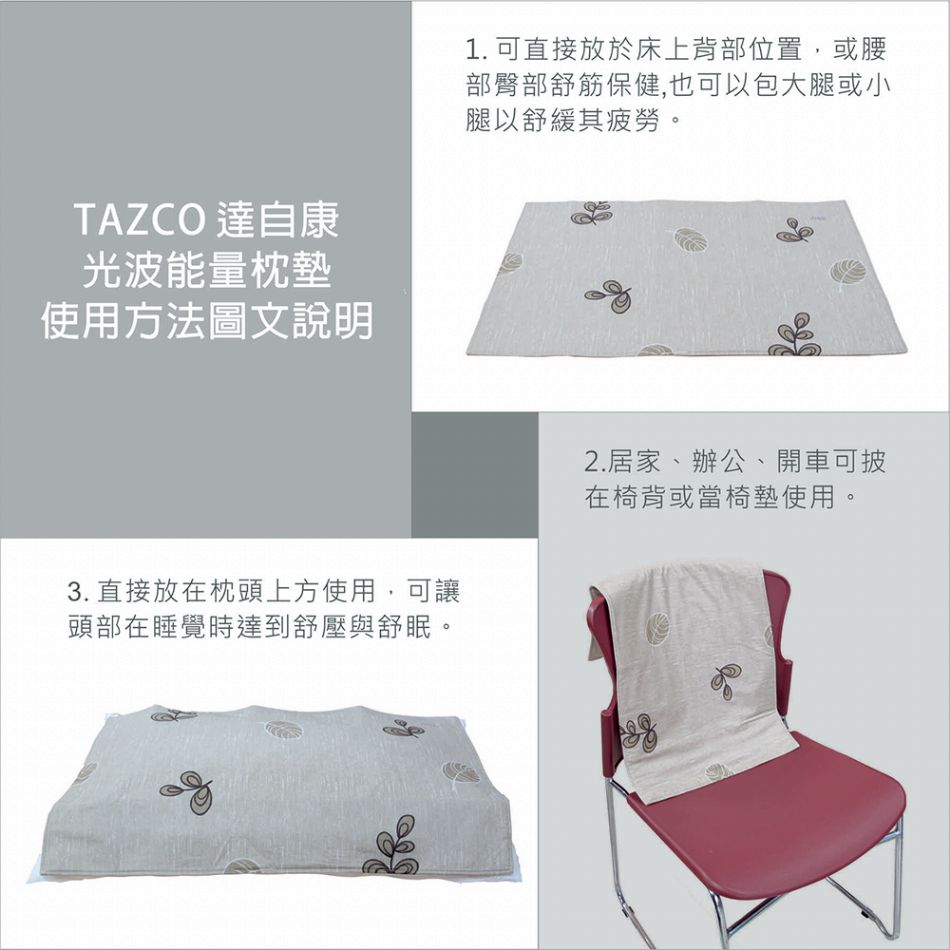 TAZCO達自康-光波能量舒活枕墊-使用方式: 使用時素色朝下,花紋布面朝上。 可直接放於枕頭上,或舖於椅子上。 必要時也可用來包覆大腿、小腿、膝蓋或腹部。
