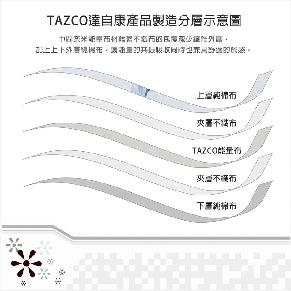 成分:表布材質-100%純棉,內層材質-100%TAZCO光波能量布。