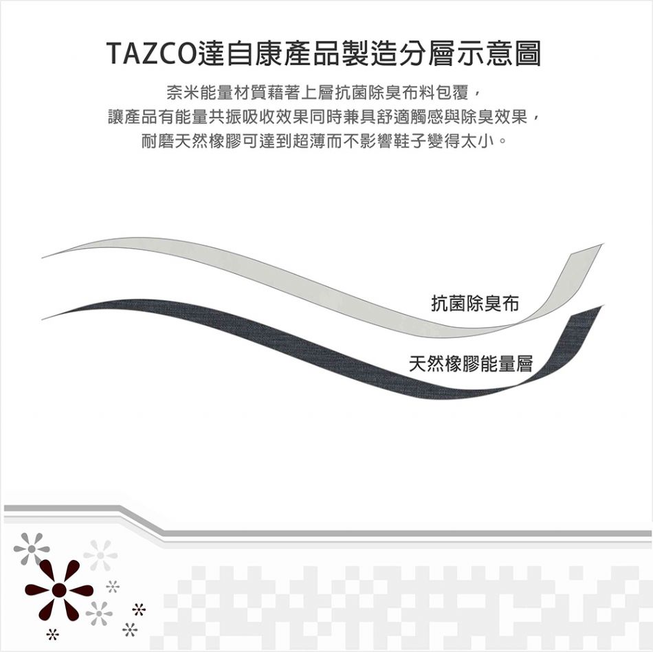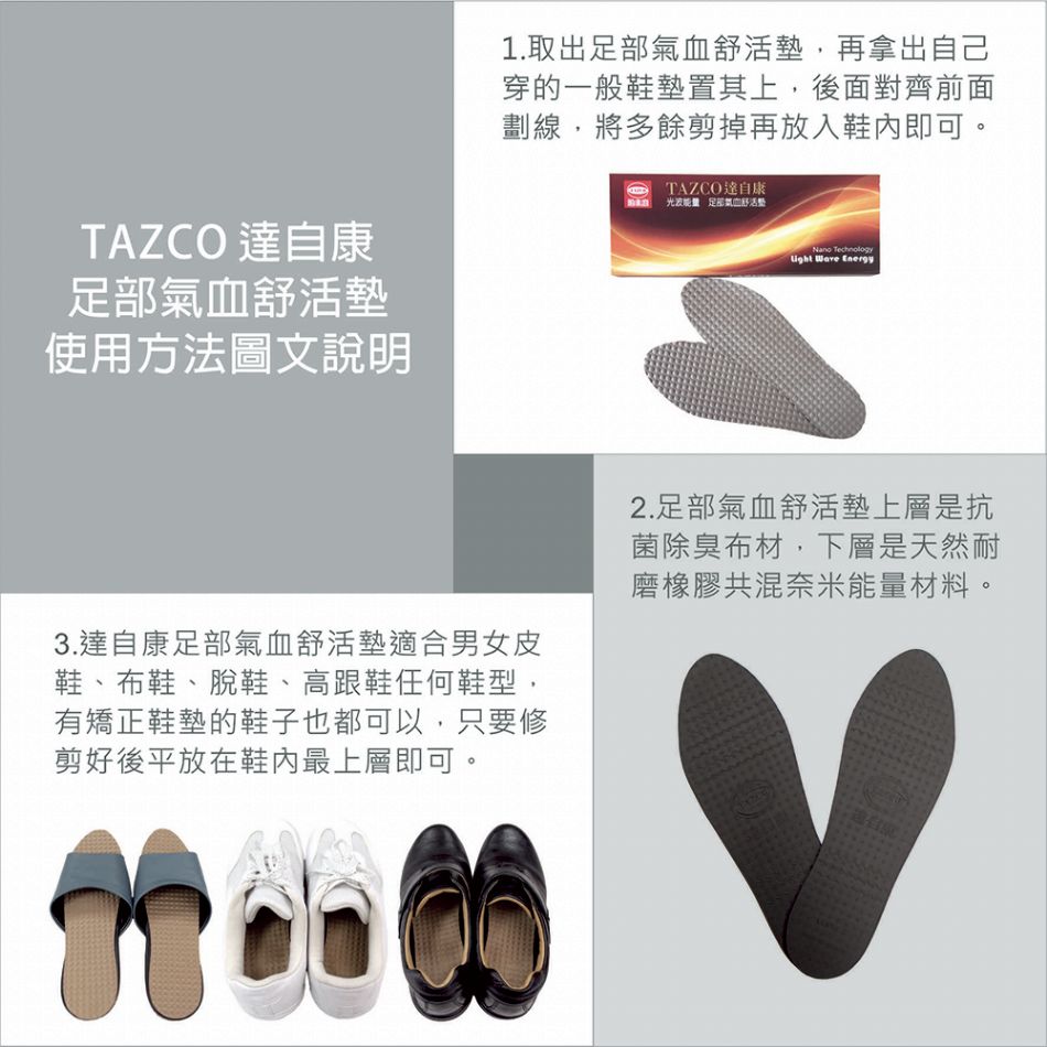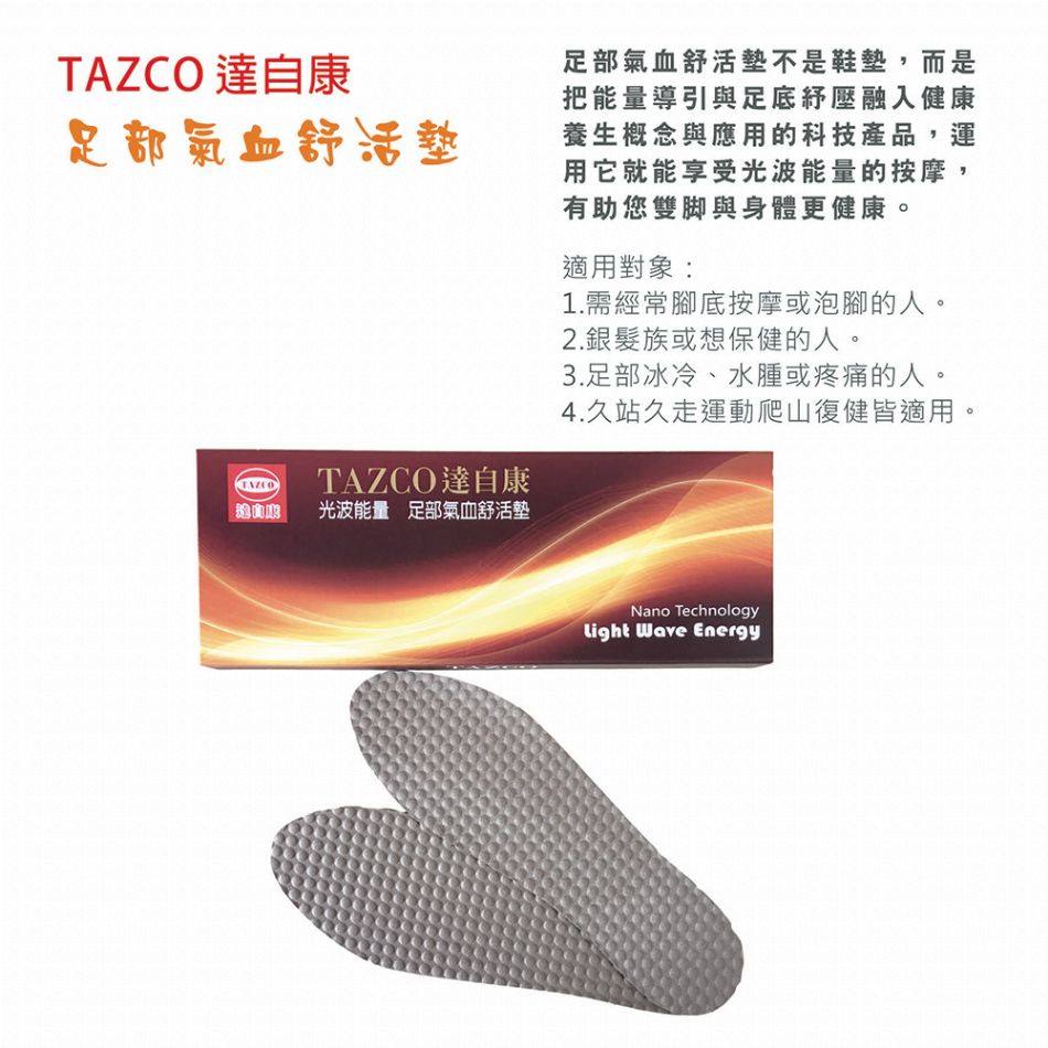 TAZCO達自康『足部氣血舒活墊』不是鞋墊,而是把【能量導引】與【足底紓壓】融入健康養護概念與應用的一雙科技性產品,運用它在穿鞋時就能幫助腳部與健康的養護,讓使用者在穿鞋走路時就能享受光波能量的腳底按摩,是針對現代人在忙碌生活中對健康保健的須求所特別設計。有1.腳底保暖,促進循環,2.光波按摩,活化經絡,3.抗菌防臭等幫助。