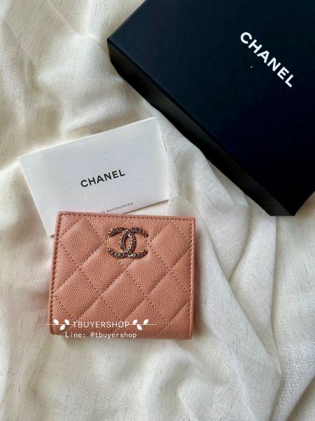 Chanel 奶茶 淡金 荔枝皮 鏤空大雙c 對開短夾