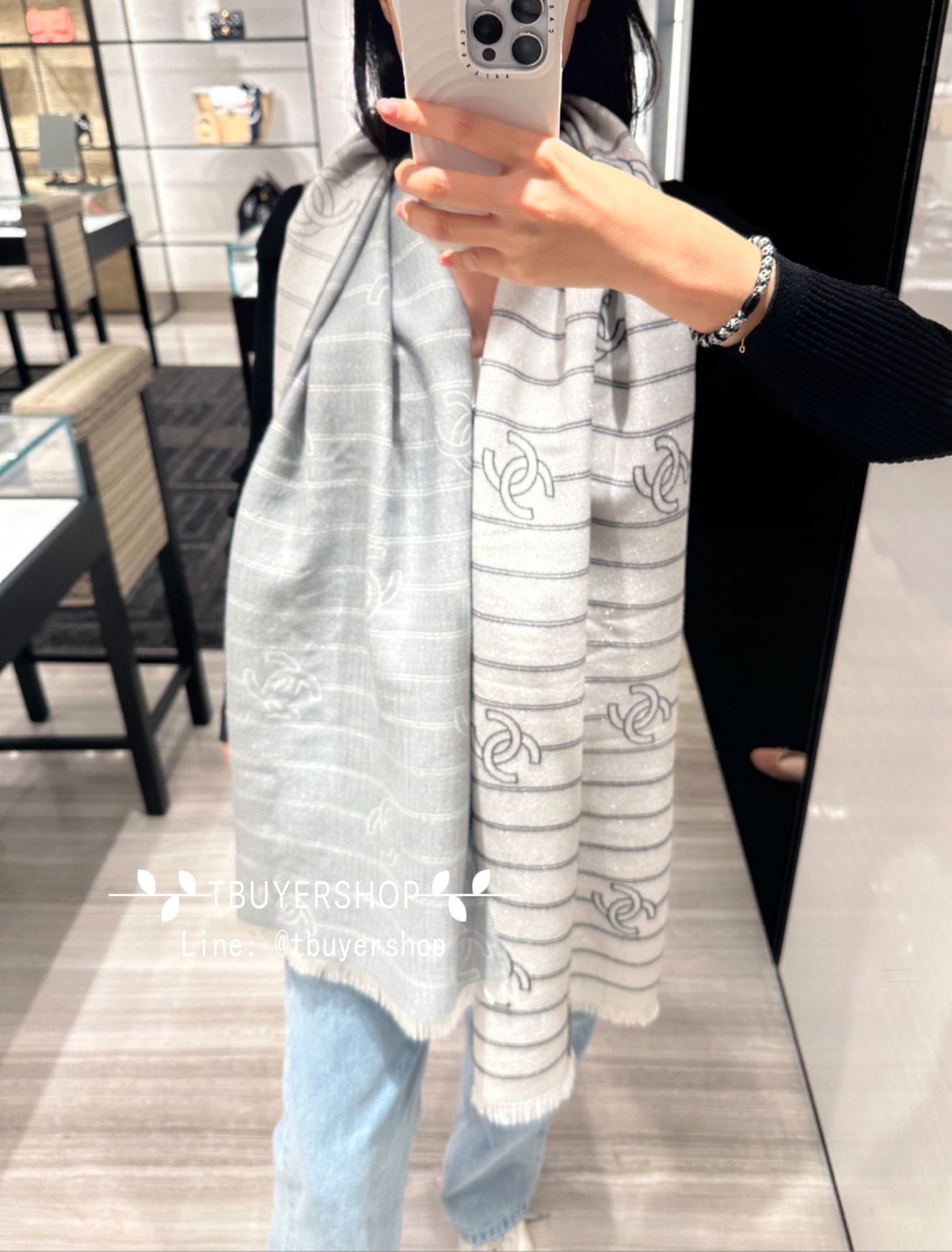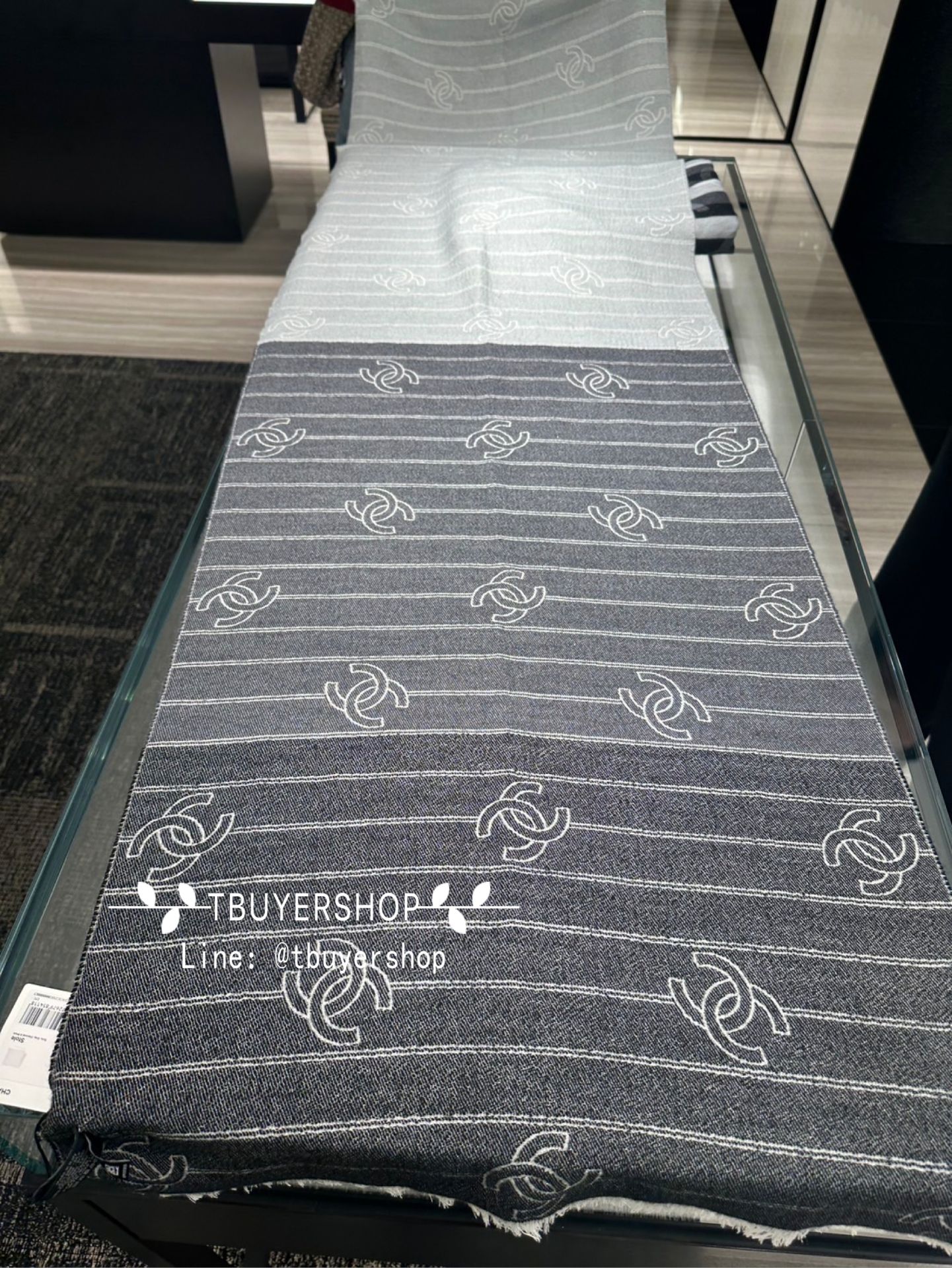 Chanel 灰白拼接 滿版雙 C圍巾