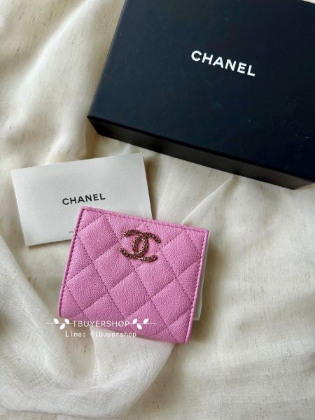 Chanel 粉色 淡金 荔枝皮 鏤空大雙c 對開短夾