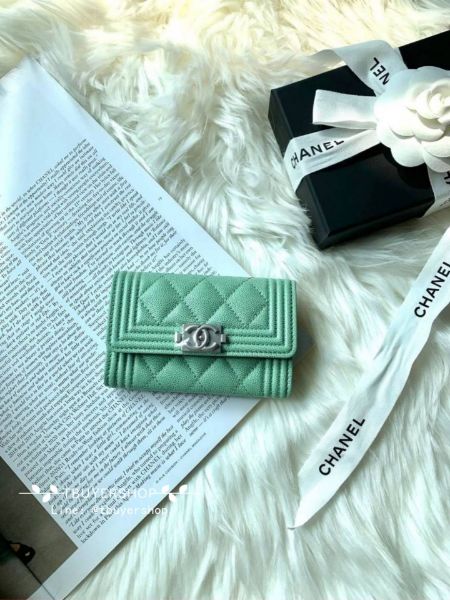 Chanel boy 綠色 銀扣 荔枝皮 單層翻蓋卡包/錢包