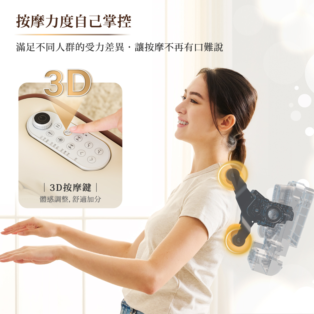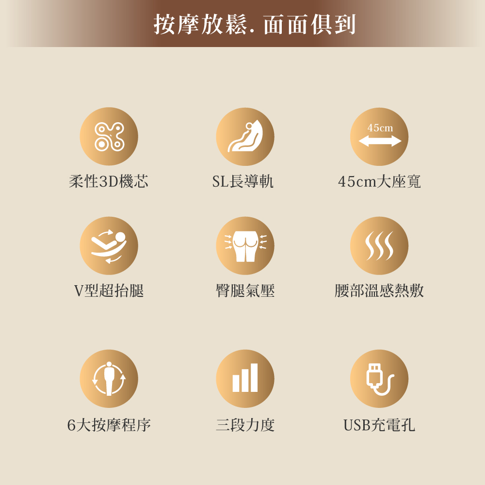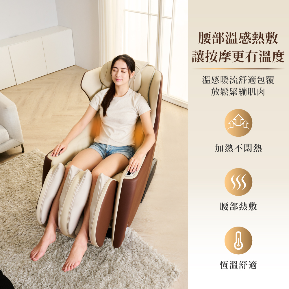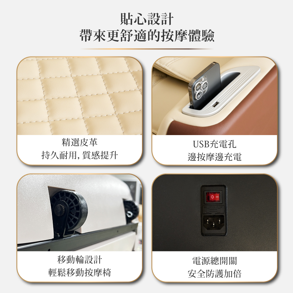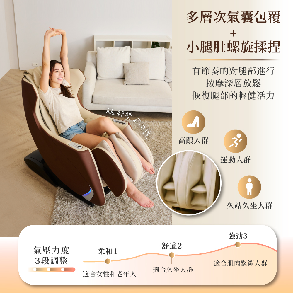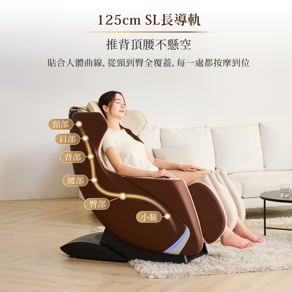 商品特色 ⭐年度新品⭐ ✨V型超抬腿,舒緩腿部壓力 ✨柔性3D機芯,體感舒適加分 ✨125cm SL長導軌,從頸到臀全覆蓋 ✨多層次氣囊包覆+小腿肚螺旋揉捏 ✨6種按摩模式,仿真人手法