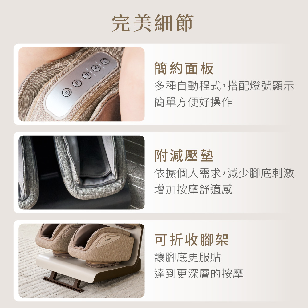 商品特色 🔸全包覆按摩+腳踝拉伸 🔸轉腳踝會鬆-獨特Ω迴旋設計 🔸按足底會鬆-螺旋推揉按摩 🔸揉小腿會鬆-氣囊x滾輪x凸點 🔸直立翻轉,按大腿 🔸36種組合,專業按摩 🔸3段力度任你調 🔸六種模式任你選 🔸溫熱按摩更舒適 新品上市,tokuyo 多會鬆 踝旋美腿機 TF-660,讓您在家享受專業級的足部按摩體驗。這款全包覆按摩設計,不僅能有效舒緩疲憊的雙腳,還具備腳踝拉伸功能,幫助提升腿部的靈活度與舒適感。無論是長時間站立後的放鬆,或是日常保健,都是您的理想選擇。讓tokuyo陪伴您,輕鬆擁有美腿與健康的生活!