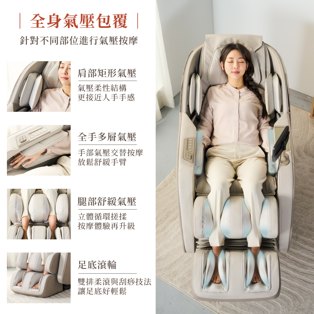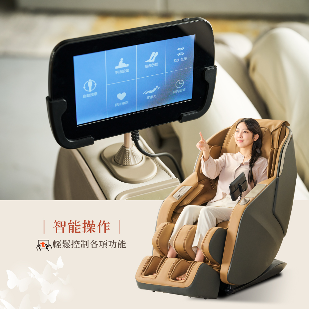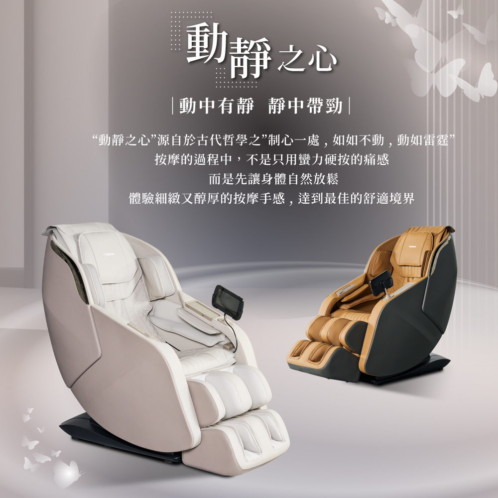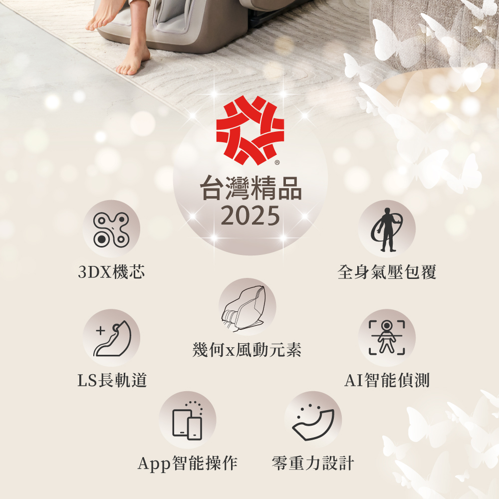 商品特色 動靜之心3DX-II機芯:提供多維度的按摩效果。 AI偵測:智能識別使用者疲勞。 LS型長按摩軌道:覆蓋整個背部。 小腿揉捏+足底雙排滾+腳後跟包覆 全身氣壓包覆:針對不同部位進行氣壓按摩。 零重力設計:減少脊椎壓力。 App智能操作:輕鬆控制各項功能。 MIT 台灣精品 銷售重點 榮獲 2025年 台灣精品獎 台灣製造