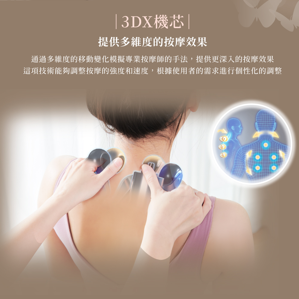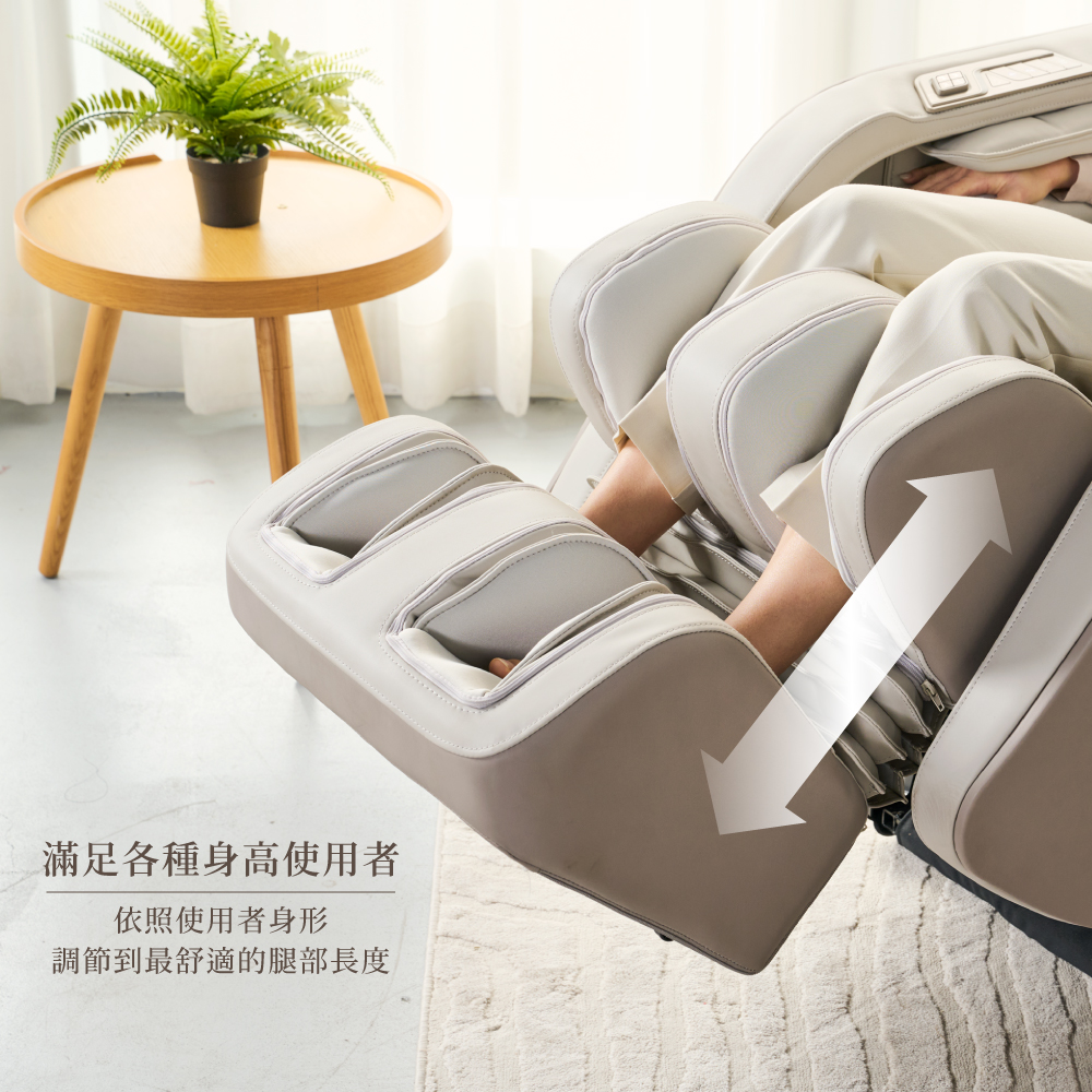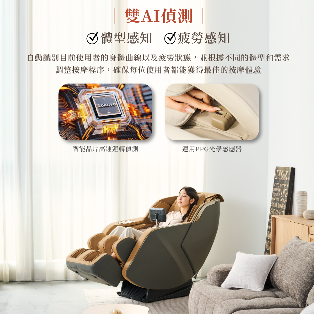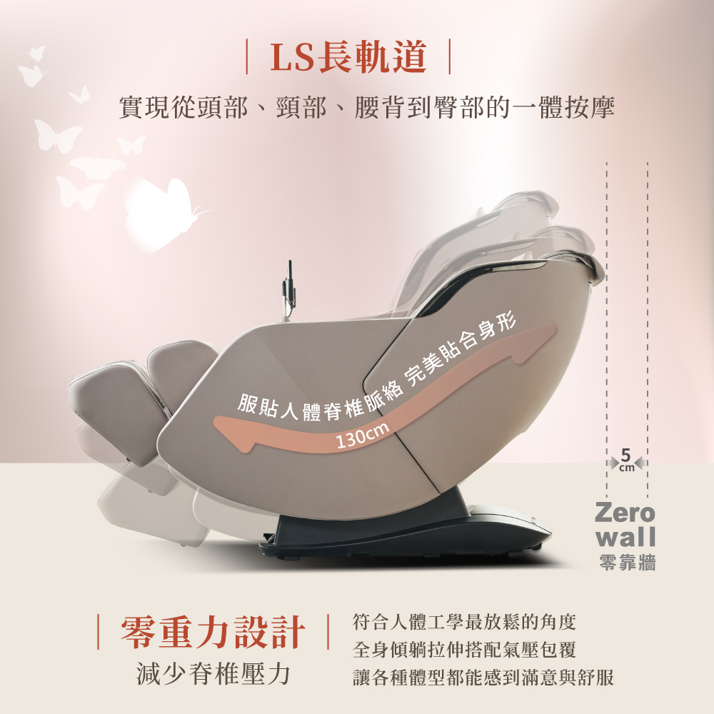 商品特色 動靜之心3DX-II機芯:提供多維度的按摩效果。 AI偵測:智能識別使用者疲勞。 LS型長按摩軌道:覆蓋整個背部。 小腿揉捏+足底雙排滾+腳後跟包覆 全身氣壓包覆:針對不同部位進行氣壓按摩。 零重力設計:減少脊椎壓力。 App智能操作:輕鬆控制各項功能。 MIT 台灣精品 銷售重點 榮獲 2025年 台灣精品獎 台灣製造