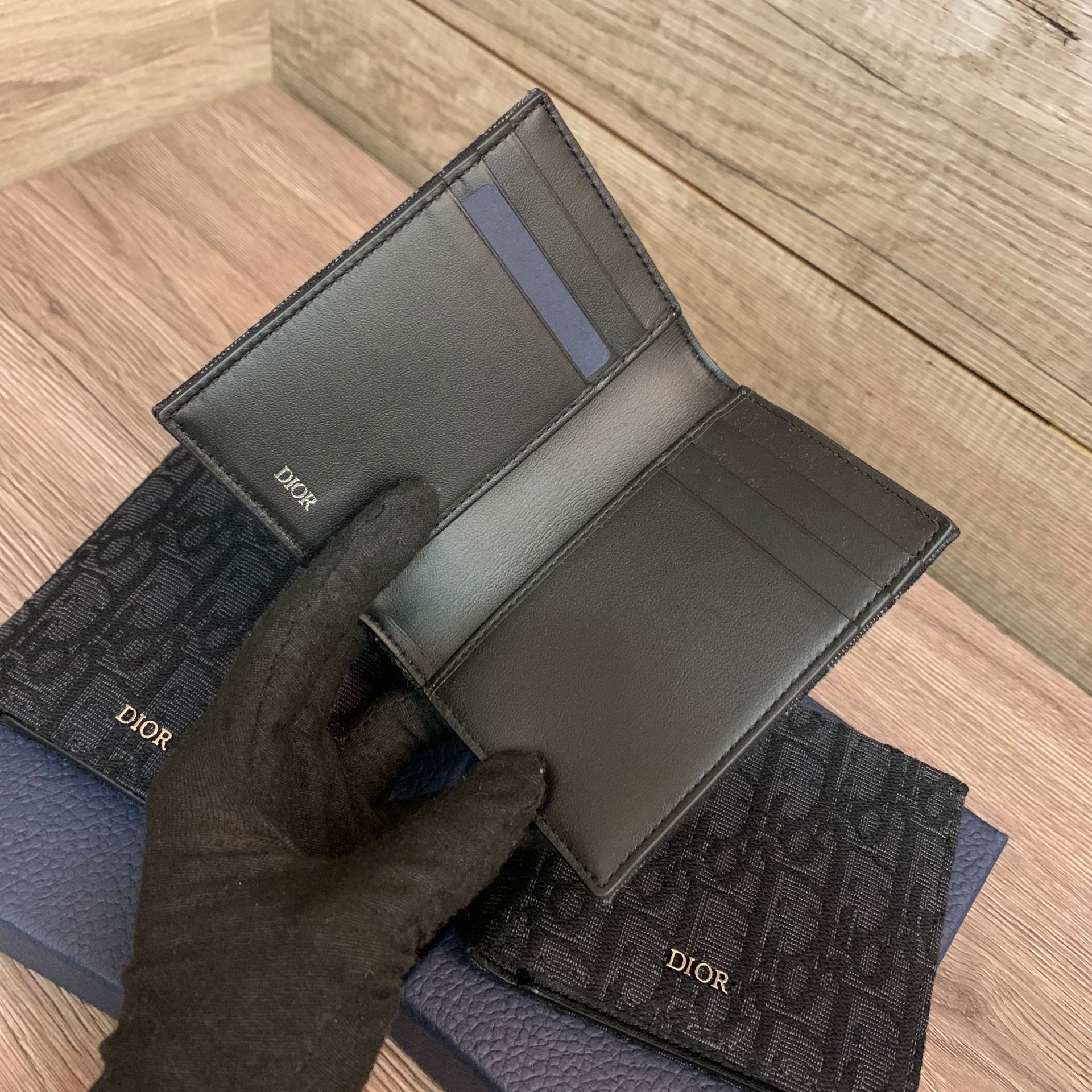 黑色 Dior Oblique 緹花外側搭配黑色小牛皮內層,突顯品牌的獨特精湛工藝,兩側分別有三個卡片夾層,還有兩個發票收納袋。款式優雅,能輕鬆放入任何口袋。