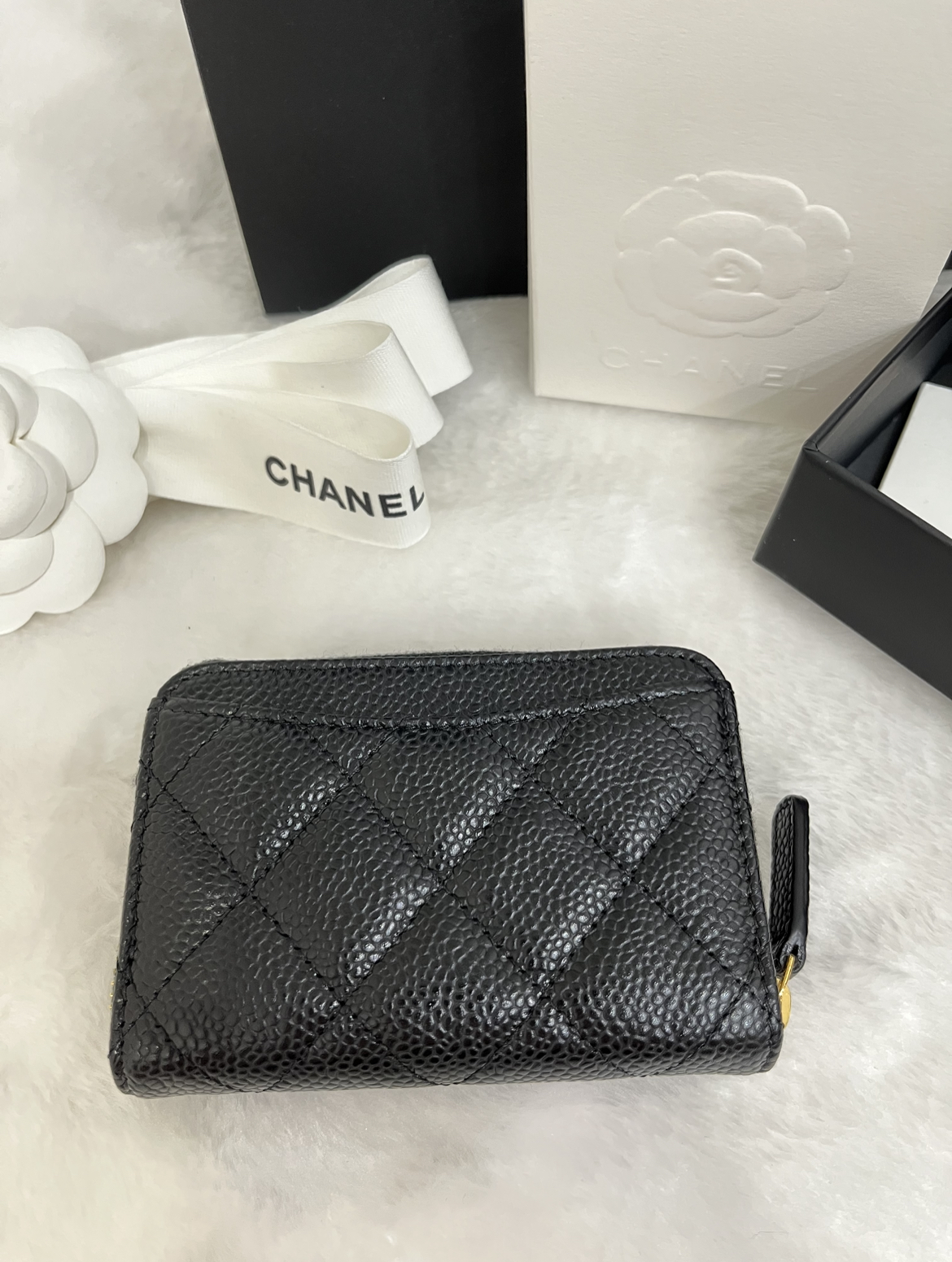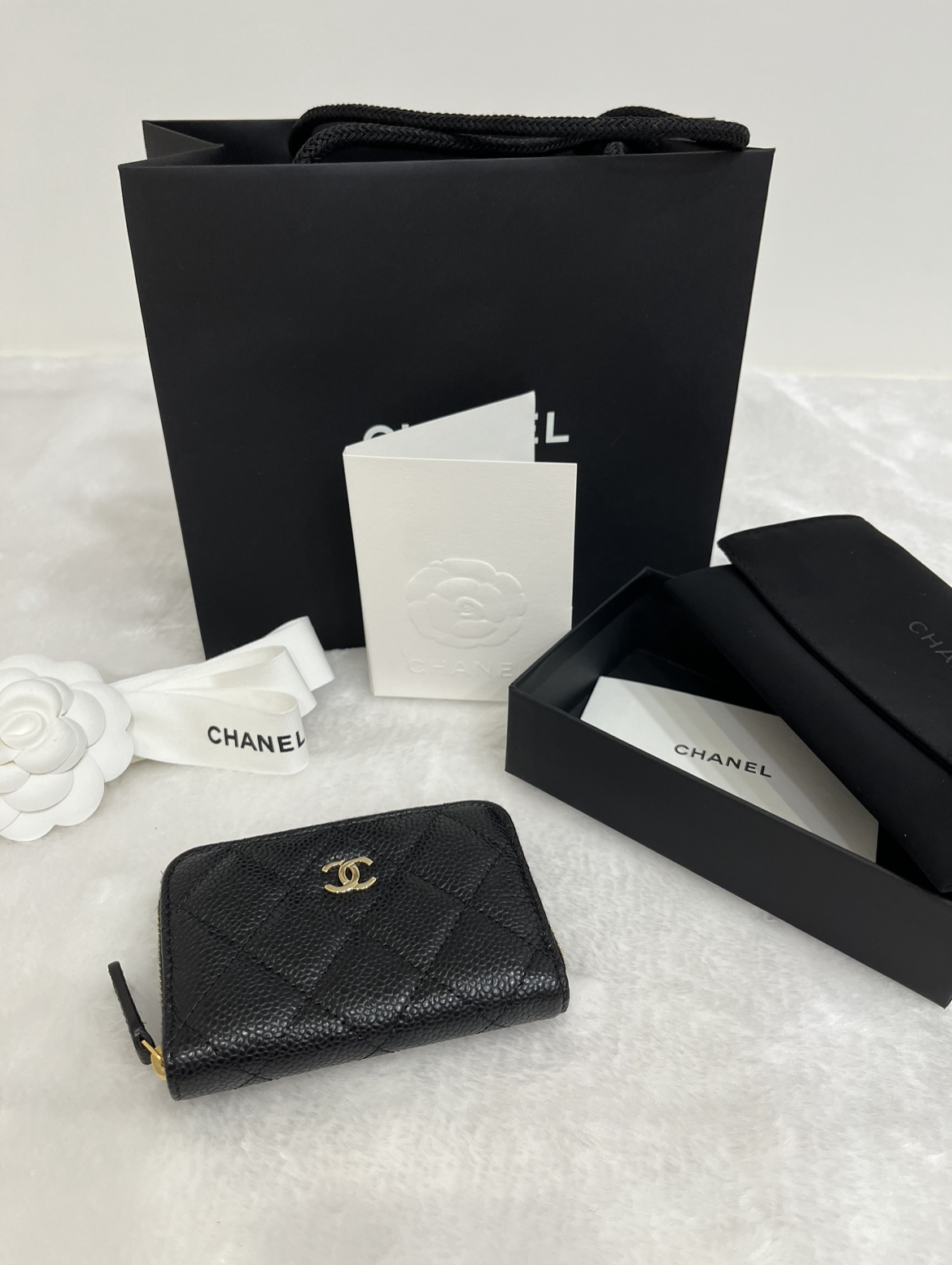 CHANEL 經典菱格紋 拉鍊卡包 荔枝牛皮/香檳金扣 尺寸:7.5*11*2 cm 配件:盒、防塵袋、紙袋、花、緞帶、購證正本 *全新日本購入未使用 *保證正品 #chanel #黑金 #經典 #拉鍊卡包 #荔枝牛皮