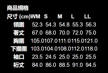 WM (着丈:56.2 / 肩幅:39.0 / 胸囲:102.5 / 腰圍90-101.5 / 袖丈:65.5)