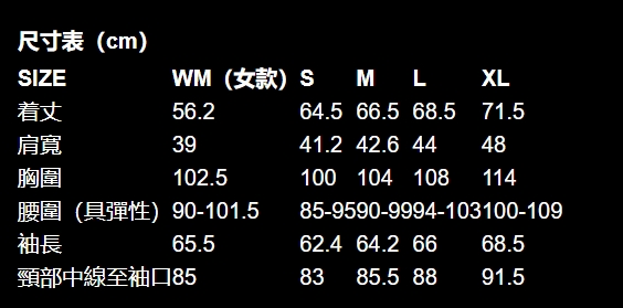 M 衣長:66.5 / 肩寬:42.6 / 胸寬:104 / 腰寬(具彈性):99-90 / 袖長:64.2 頸部中線至袖口:85.5