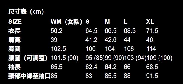 M 衣長:66.5 / 肩寬:42.6 / 胸寬:104 / 腰寬(具彈性):99(90) / 袖長:64.2 / 頸部中線至袖口:83