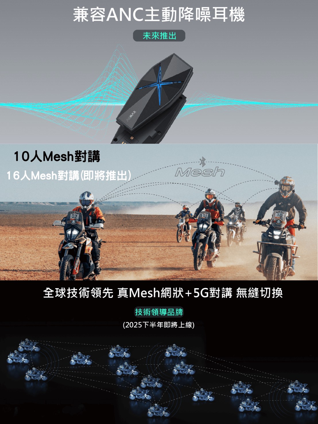 •10人"真Mesh"網狀動態連線,小群組車隊溝通暢行無阻(未來增加至16人)