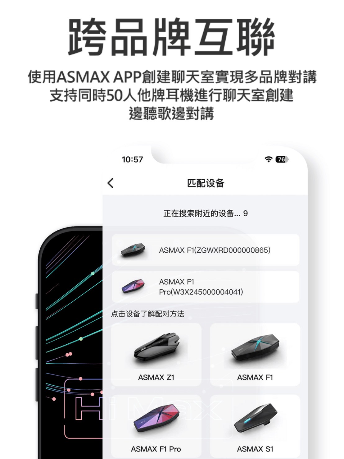 •ASMAX APP雲聯模式支援它牌耳機下載連結,並創建網路聊天室達50人不同品牌通訊
