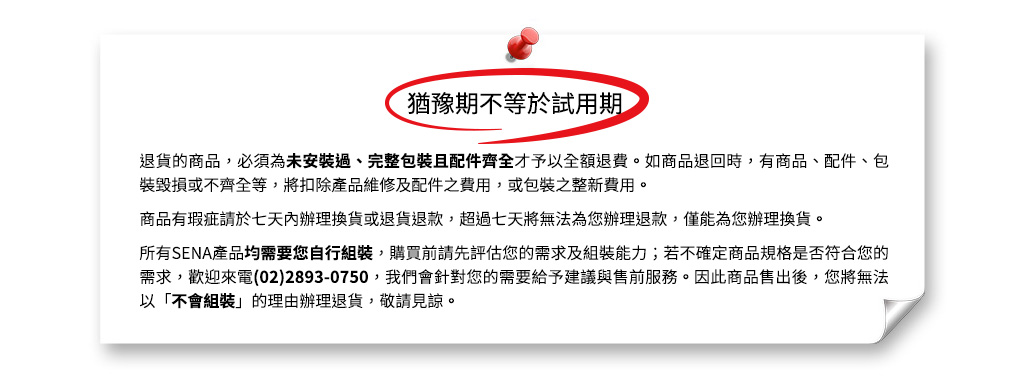‧SENA耳機商品均享有基本一年保固,至指定網站註冊後主機則可延長一年保固(共兩年),惟因人為因素導致故障,不在保固範圍內。