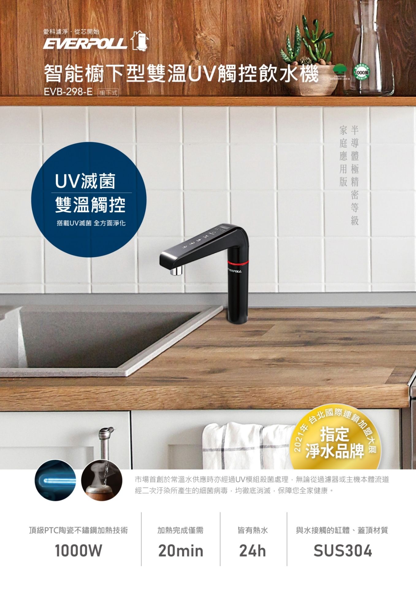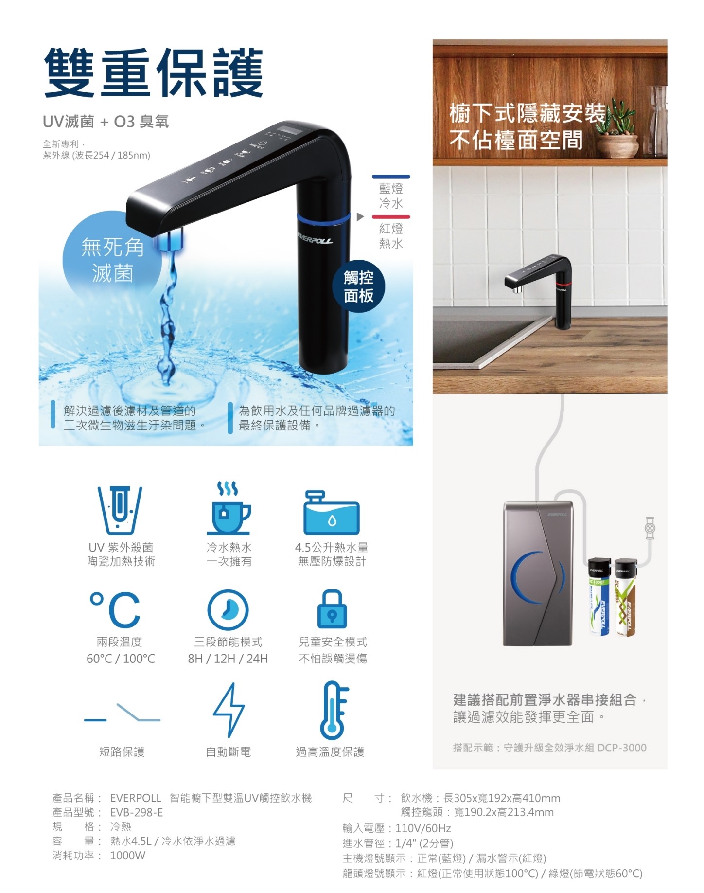 (熱銷款) EVERPOLL 智能廚下型雙溫UV觸控淨水器飲水機+守護升級全效淨水組 G38MEVB-298-E-DCP3000