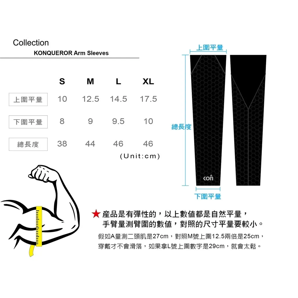 KONQUEROR Arm Sleeves ZERO - UPF50+ 紫外線遮蔽率99% 選材專利膠原蛋白紗N6U布料, 擁有極佳親膚舒適感,專為長時間騎乘騎士所設計, N6U面料可以提供良好的保濕感,長時間效果越明顯。 膠原蛋白纖維是一種仿生纖維的專利超分子技術, 使用食材廢棄物─魚鱗回收再處理後的膠原蛋白 胜肽胺基酸與紡織素材結合,進而帶來仿造動物纖維 的性能,而非使用一般塗層技術或後處理加工。除了減少 後端化學助劑的添加、減少對環境的傷害汙染,更能創造出 具有親膚舒適的仿生機能纖維。 UMORFIL美膚纖維紡生纖維系列皆通過醫療等級皮膚敏感與 皮膚刺激測試(ISO 10993),敏感肌都適用的素材 天然親膚的仿生性機能,洗滌之後仍可維持功能。 膠原蛋白纖維含有適量的膠原蛋白胜肽氨基酸和多種氨基酸, 有高達16~18%的含水量,遠高於棉花的8%、聚酯纖維的0.4%, 可以讓皮膚保持最佳的保濕感與幫助減緩皮膚表面的水分散失。 面料詳細說明可以參考 UMORFIL優膚美 官網。 S 上圍平量 10cm 下圍平量8cm 總長38cm M 上圍平量 12.5cm 下圍平量9cm 總長44cm L 上圍平量 14.5cm 下圍平量9.5cm 總長46cm XL 上圍平量 17.5cm 下圍平量10cm 總長46cm (XL尺寸極大,請先確認) 臂圍建議 S: 22-28 cm(女生建議) M: 28-34 cm L: 32-38 cm XL: 37-45up cm 量測方式: 產品是有彈性的,以上數值都是自然平量, 手臂量測臂圍的數值,對照的尺寸平量要較小。 假如A量測二頭肌是27cm,對照M號上圍12.5兩倍是25cm, 穿戴才不會滑落,如果拿L號上圍數字是29cm,就會太鬆。